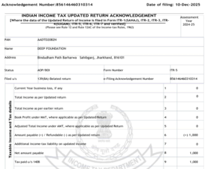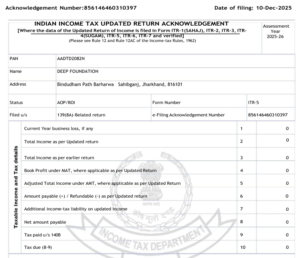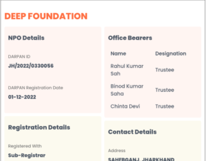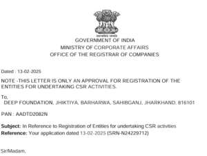 TRUST DEED CSR DARPAN ID. PAN CARD ITR ITR 25-26 ITR 24-25 ITR 23-24 ITR 22-23 Deep foundation is a non-profit organization committed to serving humanity by guiding, supporting, and empowering underprivileged communities through dedicated social welfare initiatives. Support Link > Home > About us > Our Team > Certificate > Gallery Support Link > Privacy Policy > Help Center > Terms & Conditions > Customer Care Company Info Bindudham Path Barharwa Sahibganj, Jharkhand-816101 info@deepfoundationsahibganj.org +917482073320 Office timeing :- 9:00AM To 6:00PM (Mon to Sat) DONATE NOW Facebook Twitter Youtube